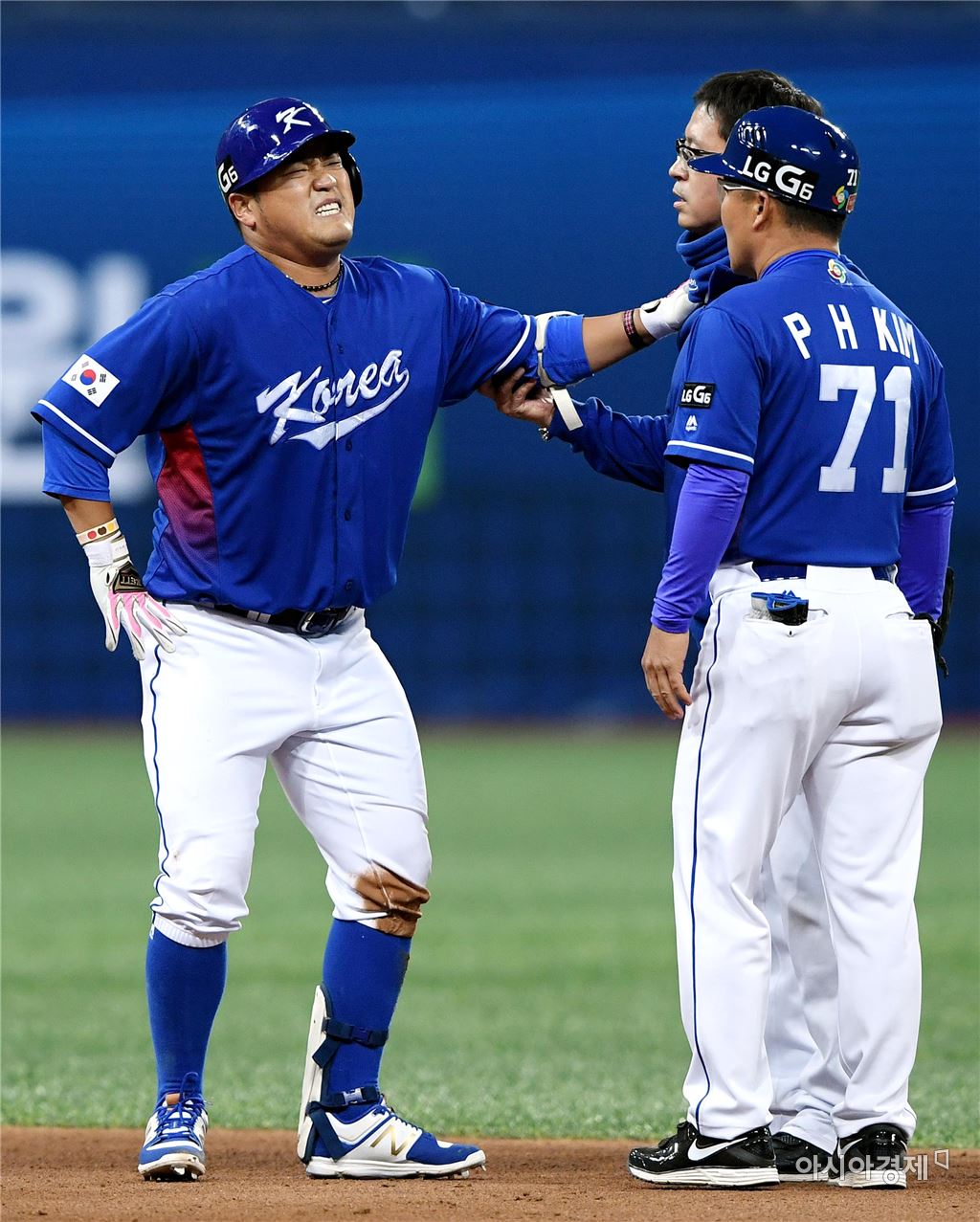 [아시아경제 김현민 기자]7일 서울 고척돔에서 열린 2017 월드베이스볼클래식(WBC) 1라운드 A조 조별예선 야구대표팀과 네덜란드의 경기, 5회초 대표팀 선두타자 박석민이 좌익수 옆 2루타를 치고 출루한 뒤 통증을 호소하고 있다.김현민 기자 kimhyun81@asiae.co.kr<ⓒ세계를 보는 창 경제를 보는 눈, 아시아경제(www.asiae.co.kr) 무단전재 배포금지>