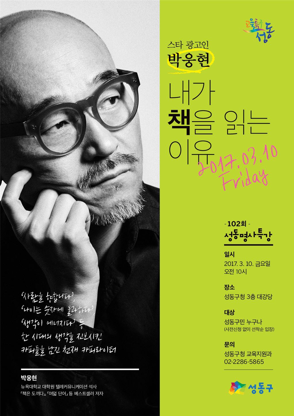 [아시아경제 박종일 기자] 성동구(구청장 정원오)는 10일 오전 10시 성동구청 3층 대강당에서 박웅현 카피라이터를 초청, 제102회 성동명사특강을 개최한다.인문학적 소양을 중요하게 생각하는 박웅현 강사는 ‘사람을 향합니다’, ‘나이는 숫자에 불과하다’, ‘생각이 에너지다’ 등 인문학적 가치와 감수성이 드러나는 카피들을 남겨 전문가들로부터 한 시대의 생각을 진보시킨 천재 카피라이터로 평가받고 있다.또 ‘책은 도끼다’, ‘여덟 단어’ 등 베스트셀러 저자로 인문학 독자들에게 큰 사랑을 받고 있을 뿐 아니라 칸 국제 광고제, 아시아퍼시픽 광고제의 심사위원을 맡는 등 광고인으로도 활발하게 활동 중이다.