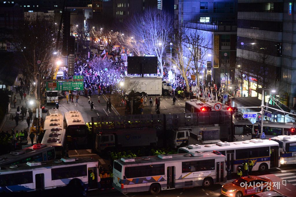 [아시아경제 문호남 수습기자] 박근혜 대통령 탄핵심판 사건 선고를 하루 앞둔 9일 서울 종로구 헌법재판소 인근에서 박근혜 대통령 탄핵 기각 집회가 열리고 있는 가운데 경찰들이 만일의 사태에 대비해 차벽을 설치하고 있다.문호남 수습기자 munonam@asiae.co.kr<ⓒ세계를 보는 창 경제를 보는 눈, 아시아경제(www.asiae.co.kr) 무단전재 배포금지>
