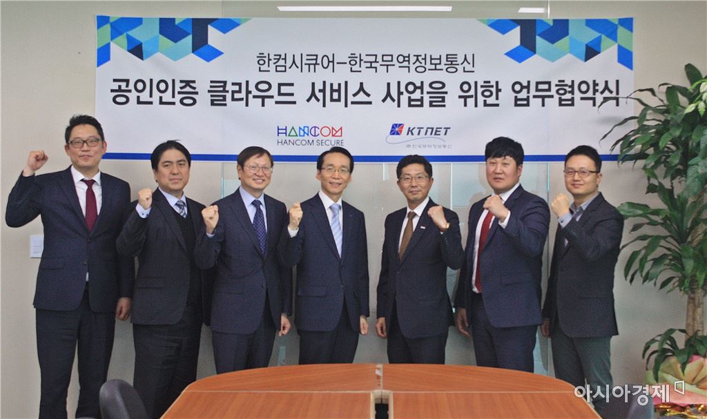 한컴시큐어와 한국무역정보통신이 클라우드 공인인증사업을 위한 업무협약을 체결했다. 왼쪽에서 네번째 한국무역정보통신 오선근 전자상거래무역본부장, 오른쪽에서 세번째 한컴시큐어 함덕환 영업총괄 본부장.