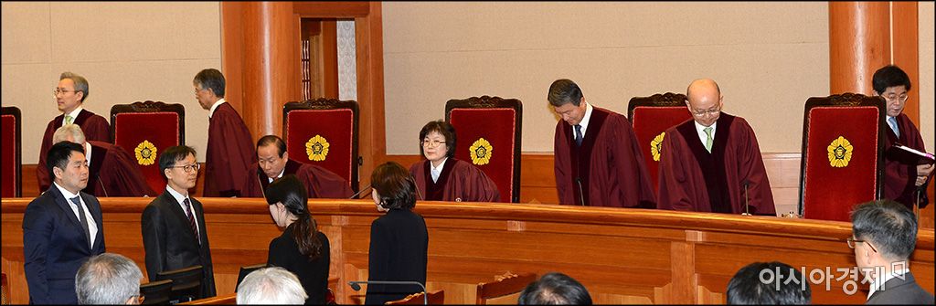 [사진공동취재단] 10일 서울 종로구 헌법재판소 대심판정에서 박근헤 대통령 탄핵심판 선고가 이정미 헌재소장 권한대행 주재로 열리고 있다. 이날 헌재 재판관들은 전원만장일치로 박 대통령에 대한 탄핵 인용을 결정했다.윤동주 기자 doso7@asiae.co.kr<ⓒ세계를 보는 창 경제를 보는 눈, 아시아경제(www.asiae.co.kr) 무단전재 배포금지>