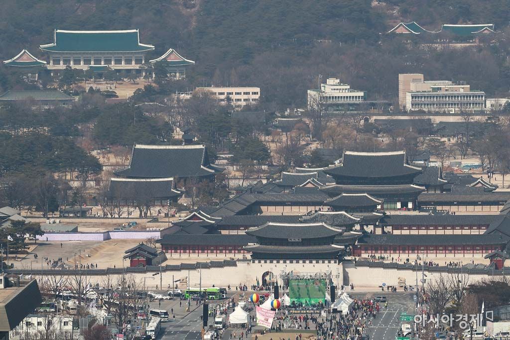 [아시아경제 ] 박근혜 대통령이 파면(탄핵인용)된 가운데 11일 오후 서울 광화문광장에서박근혜정권퇴진비상국민행동(퇴진행동) 주최로 탄핵을 환영하는 제20차 범국민행동의 날 행사가 준비중이다. 청와대 본관 오른쪽 지붕만 보이는 대통령 관저에는 박근혜 전 대통령이 퇴거하지 않은 채 머물고 있다.<사진공동취재단><ⓒ세계를 보는 창 경제를 보는 눈, 아시아경제(www.asiae.co.kr) 무단전재 배포금지>