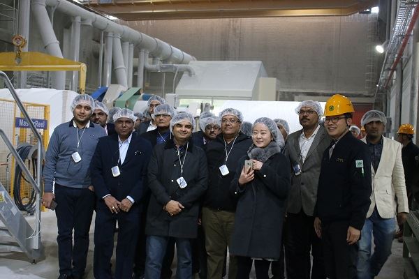 깨끗한나라 청주공장을 방문한 인도지류도매업자단체연합회(FPTA) 소속 회원들이 생산시설을 둘러보면서 관계자들과 함께 기념촬영을 하고 있다.