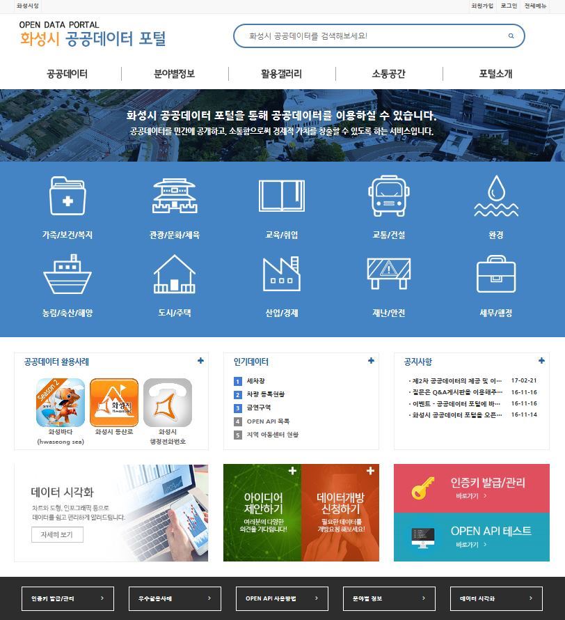 [아시아경제(화성)=이영규 기자] 경기도 화성시가 15일부터 시가 보유한 공공데이터를 누구나 쉽게 찾아 활용할 수 있도록 '화성시 공공데이터 포털'(data.hscity.go.kr)을 정식 오픈한다. 제공대상 공공데이터는 시민들의 관심이 높은 공중화장실, 무료급식소, 모범음식점과 교육ㆍ교통ㆍ관광ㆍ산업 등 230여종이다. 시는 특히 시민들이 공공데이터를 쉽게 활용할 수 있도록 오픈API, 파일데이터 등의 형태로 제공한다. 필요한 데이터는 개방신청도 가능하다. 시는 지속적인 데이터 정비를 통해 정확한 정보를 제공하고 단계적으로 공개 범위를 확대할 계획이다. 김근범 시 정보통신과장은 "공공데이터 개방으로 민간에서 다양한 사업기회와 일자리 창출효과를 얻을 수 있을 것으로 기대한다"고 밝혔다. 시는 공공데이터 포털 오픈 기념행사로 오는 29일까지 '화성시 공공데이터 포털에 바란다'를 운영한다. 화성시 공공데이터 포털에 접속해 포털 활성화를 위한 아이디어 또는 개방을 원하는 데이터를 남기면 추첨을 통해 50명에게 커피ㆍ음료 교환권을 증정한다.이영규 기자 fortune@asiae.co.kr<ⓒ세계를 보는 창 경제를 보는 눈, 아시아경제(www.asiae.co.kr) 무단전재 배포금지>