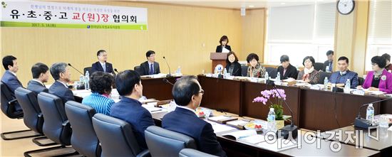 [아시아경제 노해섭 기자]곡성교육지원청(교육장 박찬주)은 14일 관내 유·초·중·고 교(원)장, 장학사, 행정지원과 팀장 등 25명이 참석한 가운데 중회의실에서 교장단 회의를 개최했다. 이번 교장회의에서는 2017학년도 1분기 주요 추진 업무에 대한 안내와 교원행정업무경감 방안 및 학생들의 독서 활성화 방안에 관한 다양한 의견을 공유하는 시간을 가졌다.교원행정업무경감에서는 학교에서의 공문서 유통량이 많으면 교사들의 업무체감도가 높아 교원행정업무가 많다고 생각하고 있기 때문에 분담 업무에 대한 이해와 설득이 필요하다는 의견과 교사들이 수업에 집중할 수 있도록 학교별 교원행정업무전담팀이 제 역할을 하여 학교장이 관심을 갖고 교감 중심 행정업무 처리를 관할해야한다는 다수의 의견에 공감했다.독서교육 활성화 방안에서는 학생들 책 읽는 습관의 결정적인 요소인 학부모의 역할을 강조하며 그림책 읽기 학부모연수 실시를 하여 독서활동을 독려한 사례와 학부모 독서모임 활성화로 수업 전 아침 시간 책읽어주기 활동, 그림책 읽어주는 특별한 입학식 사례를 공유했다. 또한 학부모와 함께하는 달빛도서관, 여름에는 시원하고 겨울에는 따뜻한 도서관 환경조성, 도서관 활용 수업 권장 등 학교별로 다양한 프로그램을 소개해 주는 시간을 가졌다. 곡성교육지원청은 독서·글쓰기·토론 교육을 활성화하기 위해 본·깨·적 연수와 디베이트 동아리를 활성화 시켜 수업시간에 다양한 생각이 교류되고 능동적인 대화가 가능한 교실로 만들어 가고 있어 이로 인해 학생들의 독서·토론 능력 신장이 기대되고 있다. 박찬주 교육장은 인사말을 통해 “무지개교육지구 혁신의 키워드는 배움·돌봄· 책임교육공동체이며 아이들의 미래의 꿈을 키워가기 위해서는 학생 중심의 다양한 교육활동과 과정 중심의 평가로 미래핵심역량을 기를 수 있도록 가정과 연계하여 함께 노력해야 하며 선생님들의 자발성을 이끌어 내도록 교장선생님이 리더십을 발휘해 주기를 기대한다”고 말했다.노해섭 기자 nogary@<ⓒ세계를 보는 창 경제를 보는 눈, 아시아경제(www.asiae.co.kr) 무단전재 배포금지>