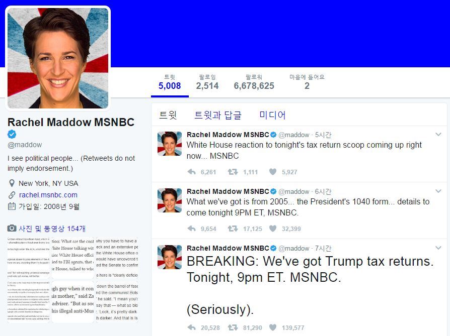 [아시아경제 이혜영 기자] 도널드 트럼프 미국 대통령이 '의도치않게' 10여년 전 소득과 세금 납부내역을 자진 공개했다. 한 방송사에서 트럼프 대통령의 납세 내역을 공개하겠다고 예고하자 이에 당황한 백악관은 해당 자료를 서둘러 발표하며 수습에 나섰다. 14일(현지시간) 미국 MSNBC 방송의 간판앵커인 레이첼 매도는 트럼프 대통령의 2005년 소득과 납세 내역이 담긴 자료를 입수했다며 오후 9시 자신의 프로그램인 '레이첼 매도 쇼'에서 이를 모두 공개하겠다는 글을 트위터에 올렸다. 매도의 예상치 못한 발언이 나오자 백악관은 트럼프 대통령의 소득과 납세 내역을 방송에 앞서 공개해버리는 방법을 택했다. 백악관은 트럼프 대통령의 2005년 소득이 1억5000만달러(약 1724억원)였으며 25%가량인 3800만달러(437억원)를 세금으로 냈다고 밝혔다. MSNBC가 방송과 온라인을 통해 공개한 자료는 소득 1억5300만달러(약 1749억원)에 세금 3650만달러(417억원) 납부였다. 납세자료에 따르면 트럼프 대통령은 2005년에 직전연도 사업의 손실로 1억300만달러(약 1178억원)의 부채를 탕감받아 수천만달러의 절세 효과를 본 것으로 나타났다. 앞서 뉴욕타임스(NYT)는 지난해 10월 트럼프 대통령이 1995년 9억1600만달러(1조478억원)의 사업 손실을 입었다고 신고해 상당기간 세금 공제 혜택을 받았고 합법적으로 납세를 피했다고 보도했다. 이번에 방송을 통해 공개된 2005년 납세 자료는 NYT 기자였던 데이비드 케이 존스턴이 입수한 것이다. 퓰리처상 수상자인 존스턴은 미 국세청(IRS)을 오랫동안 출입했던 언론인이다. 그는 레이철 매도 쇼에서 출처를 알 수 없는 우편으로 2쪽 분량의 트럼프 대통령 납세 자료를 받았다고 설명했다.방송을 통해 트럼프 대통령의 납세자료가 공개되자 백악관은 "MSNB가 시청률 때문에 납세자료를 훔쳐서 공개하는 건 완전히 불법"이라고 정면 비판했다. 백악관은 트럼프 대통령이 소득세를 포함해 수천만달러의 세금을 냈다며 "법이 부과한 세금보다 많이 낼 책임은 없다"고 강조했다. 또 '부정직한' 언론이 트럼프 대통령의 납세 자료에 집착하겠지만 "트럼프 대통령은 모든 미국인에게 혜택을 주는 세금 개혁에 집중할 것"이라고 말했다. 백악관의 이같은 반응에 MSNBC 측은 수정헌법 제1조(The First Amendment)를 내세우며 국민의 알 권리 보장 차원에서 자료를 공개한 것이라고 받아쳤다. 트럼프 대통령은 지난해 대선 후보 시절부터 감사가 끝나지 않았다는 등의 이유로 납세 실적 공개를 거부해왔다. 미국 대선 후보들은 통상적으로 선거 과정에서 세금 납부 내역을 공개해왔지만 트럼프는 여론의 요구를 묵살하고 '버티기'로 일관했다. 첫 자진공개인 이번 건도 사실상 등떠밀려 내놓은 자료인데다 트럼프의 전반적인 납세 실적을 판단하기엔 역부족이란 비판이 높은 상황이다. 대선 당시 힐러리 클린턴을 지지하며 '트럼프 저격수'로 활동한 데이비드 브록은 자신의 트위터에 "오늘 밤 해답보다 더 많은 의문이 남았다"며 트럼프의 완벽한 납세 자료를 내놓는 사람에게 500만달러를 주겠다는 글을 올렸다. 트럼프 대통령의 아들이자 트럼프그룹 수석 부회장을 맡고 있는 도널드 트럼프 주니어는 트위터에 "트럼프 대통령을 싫어하는 사람들에게 그가 4000만달러를 세금으로 냈다는 것을 알게 해준 레이첼 매도에 감사한다"는 글을 써 백악관의 언론 비판에 힘을 보탰다. 이혜영 기자 itsme@asiae.co.kr<ⓒ세계를 보는 창 경제를 보는 눈, 아시아경제(www.asiae.co.kr) 무단전재 배포금지>