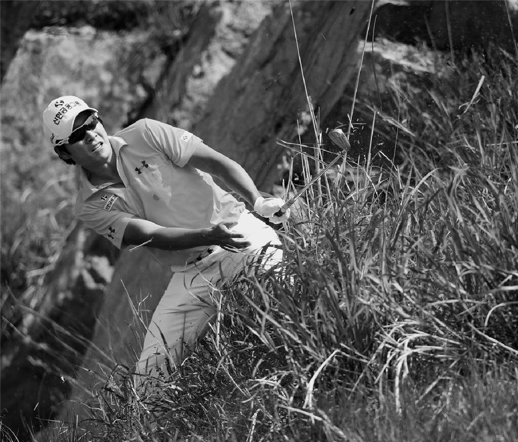김경태가 억센 러프 속에서 트러블 샷을 하고 있는 장면.