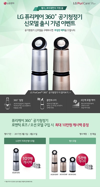 LG 퓨리케어 360 ˚ 공기청정기가 컬러를 입었다. 기존에 출시된 화이트 컬러 제품에 세련되고 부드러운 느낌의 ‘로맨틱 로즈’와 고급스럽고 시원한 느낌의 ‘로맨틱 오션’을 적용한 신제품 2종이 출시 된 것. 퓨리케어 360 ˚ 공기청정기는 이로써 8종의 제품 라인업이 완성돼 소비자들이 취향 및 사용 환경에 따른 선택의 폭을 넓혔다.LG전자는 이번 신제품 출시를 기념해 31일까지 캐시백 이벤트를 진행한다. 이벤트 대상은 로맨틱로즈, 로맨틱오션 모델을 구입하는 고객 전원이며, LG전자 70주년 행사모델 (AS281DAS) 구매 시 10만원, 행사모델(AS281DAP, AS181DAP, AS181DAS) 구매 시 5만 원 캐시백을 제공한다.한편 LG 퓨리케어 360˚ 공기청정기는 최대 전용 면적 91㎡(약 28평)로 LG 공기청정기 가운데 청정면적이 가장 넓은 것이 특징. 원기둥 형태의 이 제품은 위쪽과 가운데에 360도 구조로 설계한 흡입구와 토출구를 각각 적용해 사각지대를 최대한 줄이는 방법으로 ‘360° 청정’을 구현한다. 따라서 실내 공간의 어느 곳에 설치하더라도 실내의 공기를 더 고르게 정화한다.제품 상단의 토출구 위에 있는 ‘클린부스터’는 정화된 공기를 강력한 바람으로 만들어 멀리까지 내보낸다. 클린부스터는 55도 가량 비스듬히 기울여 져 있고 좌우로 70도 가량 회전할 수 있어 고객이 원하는 방향으로 깨끗한 공기를 보낼 수 있다. 주방에서 조리할 경우 클린부스터를 주방쪽으로 향하게 하면 음식 냄새나 초미세먼지를 더 효과적으로 정화한다.이 제품은 어린 아이들의 활동 공간을 고려해 아래쪽 토출구에서 높이 1m 미만의 공간에 집중적으로 깨끗한 공기를 내보낸다. ‘오토모드’ 기능은 실내 공기를 좋음, 보통, 나쁨, 매우 나쁨 등 4단계 오염 도로 구분하고 이에 맞춰 스스로 공기를 정화한다. 나쁨과 매우 나쁨 단계에 서는 효율적으로 정화하기 위해 클린부스터를 작동시킨다.LG전자 마케팅 관계자는 “공기청정기 컬러 제품 출시를 기념해 이번 이벤트를 기획하게 됐다”며 “봄 황사철을 맞아 공기청정기 구입을 고려하는 고객 분들께 좋은 혜택이 되길 기대한다”고 밝혔다.김정혁 기자 mail00@asiae.co.kr<ⓒ세계를 보는 창 경제를 보는 눈, 아시아경제(www.asiae.co.kr) 무단전재 배포금지>