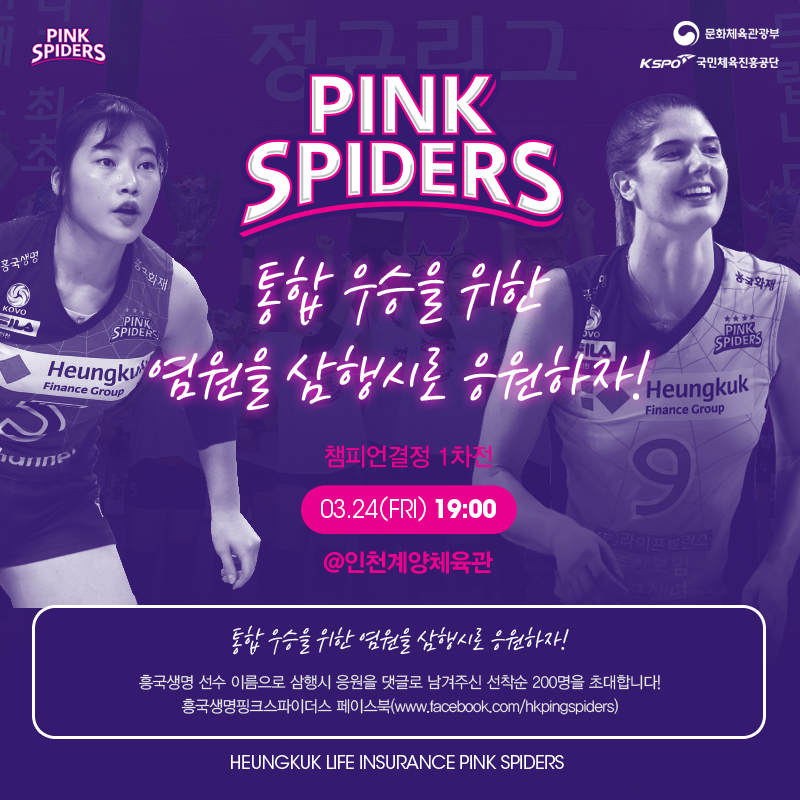 [아시아경제 김흥순 기자] 10년 만의 통합우승에 도전하는 여자 프로배구 흥국생명이 오는 24일 오후 7시 인천 계양체육관에서 열리는 챔피언결정 1차전에서 다양한 이벤트로 팬들을 맞는다. 흥국생명은 정규리그에서 V리그 최초로 선보인 핑크비트 응원존을 확대 운영할 계획이다. 핑크비트 응원존에 앉은 800여명을 대상으로 진행될 이벤트에서는 LED 팔찌가 음악에 맞춰 다양한 색깔로 변하는 고유한 응원으로 팬들에게 큰 즐거움을 선사할 예정이다. 핑크 아이템을 착용한 팬 500명에게 핑크스파이더스 캐릭터 상품을 증정하는 등 경기장 내에서도 다양한 이벤트를 해 상품을 제공한다.온라인에서도 팬들을 위한 이벤트를 하고 있다. 배구단 페이스북(https://www.facebook.com/hkpinkspiders)에서 선수들의 이름으로 삼행시를 지은 팬 총 200명을 무료로 초청한다. 17일부터는 구단 홈페이지와 인터파크를 통해 챔피언결정 1차전 티켓 예매를 시작했다. 김흥순 기자 sport@asiae.co.kr<ⓒ세계를 보는 창 경제를 보는 눈, 아시아경제(www.asiae.co.kr) 무단전재 배포금지>김흥순 기자 sport@asiae.co.kr<ⓒ아시아 대표 석간 '아시아경제' (www.newsva.co.kr) 무단전재 배포금지>