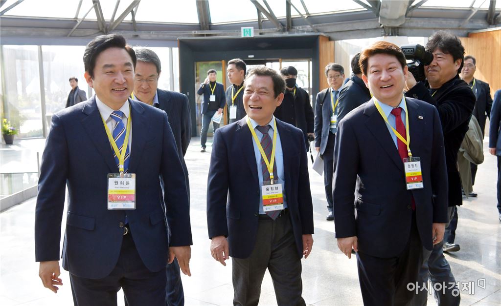 윤장현 광주광역시장(가운데)이 17일 오전 제주도 서귀포시 여미지식물원에서 열린 제4회 국제전기자동차 엑스포 글로벌 전기차 서밋(Global EV Summit) 행사에 참석하기 위해 원희룡 제주지사, 권영진 대구시장과 함께 입장하고 있다.