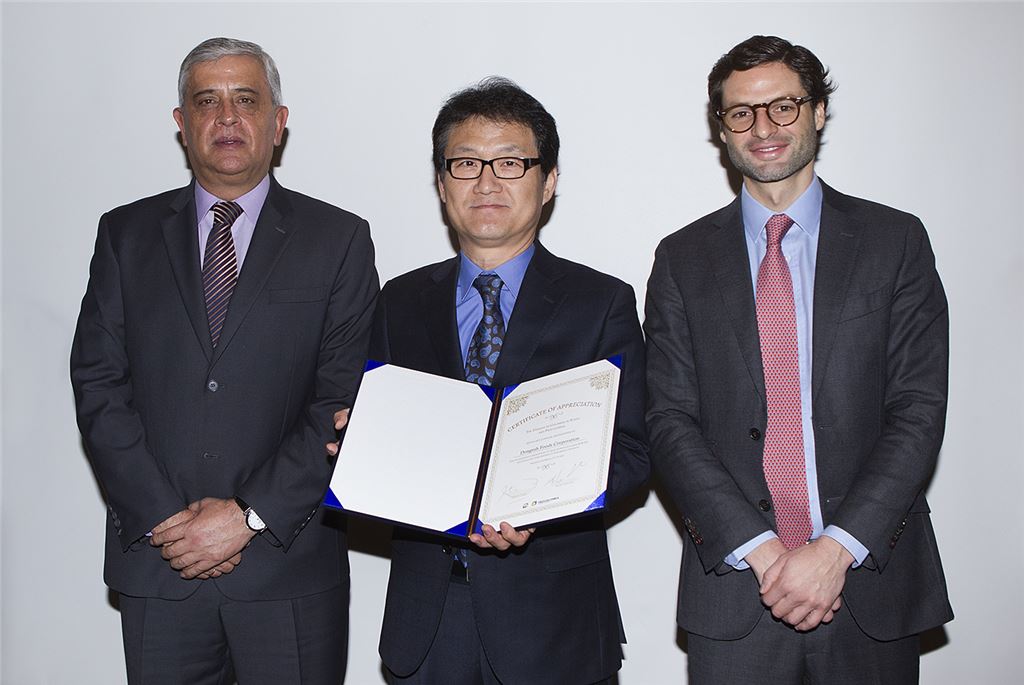 17일 서울 신라호텔에서 열린 '한-콜롬비아 FTA로 새로운 성장의 기회' 세미나에서 (왼쪽부터) 티토 사울 피니야 주한 콜롬비아 대사, 박영순 동서식품 상무, 펠리페 하라미요 콜롬비아 수출관광해외투자진흥청 사장이 기념사진을 촬영하고 있다.