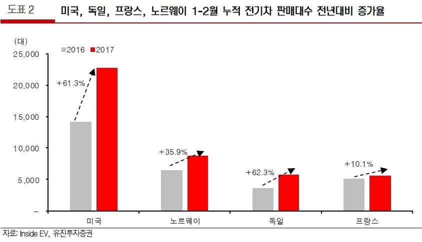 [아시아경제 박미주 기자]도널드 트럼프 미국 대통령이 연비규제 완화 검토를 밝혔지만 전기차 시장의 성장은 지속될 것으로 전망됐다.19일 한병화 유진투자증권 연구원은 "트럼프 대통령이 자동차 제조업체 대표들과 회동에서 2022~2025년 연비규제 강화를 재검토하겠다고 밝혔지만 환경단체들과 여러 주들이 오바마의 행정명령 자료를 근거로 소송을 준비 중"이라며 "연방정부의 연비규제 완화 검토에서 미국의 전기차 시장 위축은 미미할 것"이라고 밝혔다.2022년 이후의 연비문제라 자동차업체들의 현재 확정한 전기차 개발과 판매계획을 늦추기 어렵다는 이유도 들었다. 또 중국과 유럽의 강화되고 있는 연비규제를 위해서도 전기차에 대한 성장 전략을 수정하지 않을 것으로 전망했다.주요국가들의 1~2월 전기차 누적판매대수 성장세는 지속되고 있다. 미국의 누계판매대수는 전년 동기 대비 61% 증가했다. 신규 브랜드인 볼트(BOLT), 프리우스 프라임 등의 판매가 가세해서다. 독일의 누적판매량도 전년 동기보다 63% 늘었다.이에 국내 배터리 장착 전기차 판매가 확대돼 관련 소재·부품업체들의 성장이 지속될 것으로 내다봤다.한 연구원은 "시장 성장을 견인하는 전기차 모델들의 배터리는 대부분 국내 업체들이 공급하고 있다"며 "내년 베스트셀링 전기차가 될 가능성이 높은 아우디 이트론 콰트로의 배터리(삼성SDI, LG화학)와 재규어I-PACE의 배터리(LG화학) 공급업체도 국내업체들"이라고 전했다.그는 "당분간 메이저 전기차업체들의 핵심파트너들은 국내 배터리업체들"이라며 "일진머티리얼즈, 후성, 상아프론테크, 피엔티 등을 추천한다"고 했다.박미주 기자 beyond@asiae.co.kr<ⓒ세계를 보는 창 경제를 보는 눈, 아시아경제(www.asiae.co.kr) 무단전재 배포금지>