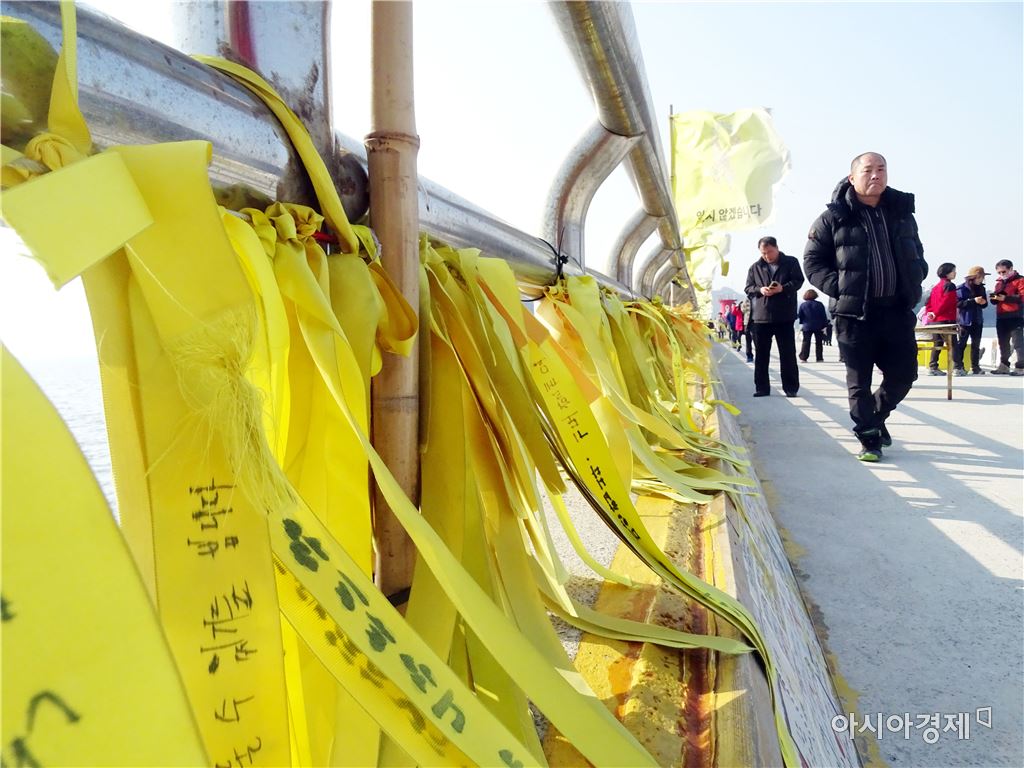 [아시아경제 노해섭 기자]휴일인 19일 오후 19일 오후 전남 진도군 임회면 팽목항 방파제에서 세월호 희생자를 기리는 리본이 바람에 나부끼고 있다. 노해섭 기자 nogary@<ⓒ세계를 보는 창 경제를 보는 눈, 아시아경제(www.asiae.co.kr) 무단전재 배포금지>