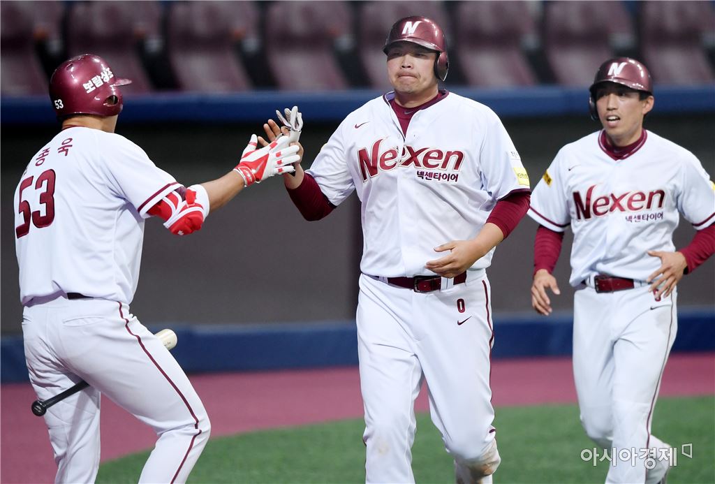 [아시아경제 김현민 기자]프로야구 넥센 김태완과 박정음이 19일 고척돔에서 열린 2017 KBO리그 시범경기 두산과의 경기, 8회말 1사 2,3루에서 이정후의 역전 2타점 적시타 때 득점한 뒤 대기타석의 고종욱과 하이파이브하고 있다. 김현민 기자 kimhyun81@asiae.co.kr<ⓒ세계를 보는 창 경제를 보는 눈, 아시아경제(www.asiae.co.kr) 무단전재 배포금지>