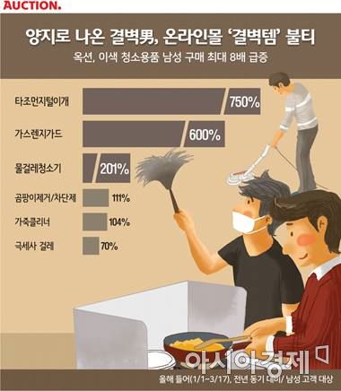 [아시아경제 오종탁 기자] 허지웅, 서장훈 등 이른바 '결벽남'들이 인기를 끄는 가운데 지나치다 싶었던 이들의 깔끔한 생활 방식도 어느새 하나의 트렌드로 자리 잡아가는 모습이다. 온라인 쇼핑몰 옥션에서 남성 고객들의 '결벽 아이템(결벽템)' 구매가 급증한 데서 이런 분위기를 엿볼 수 있다. 옥션은 올해 들어 지난 17일까지 청소, 정리 관련 용품의 남성 고객 구매량을 조사한 결과 일부 품목이 전년 동기 대비 최대 8배 이상 뛰었다고 20일 밝혔다. 우선 요리할 때 가스렌지 주변으로 튀는 기름, 음식물 오염 방지용 가스렌지가드는 올 들어 전년 대비 7배(600%)가량 판매가 늘었다. 가볍고 먼지 흡수력이 뛰어나 피규어 등 고가 제품 관리에 유용한 타조먼지털이개 판매도 같은 기간 8배(750%) 이상 급증했다. 가스렌지가드는 옥션 남성 베스트셀러 상품에 3주 동안 머물렀다. 타조먼지털이개도 인기 키워드에 이름을 올렸다.(옥션 제공)
