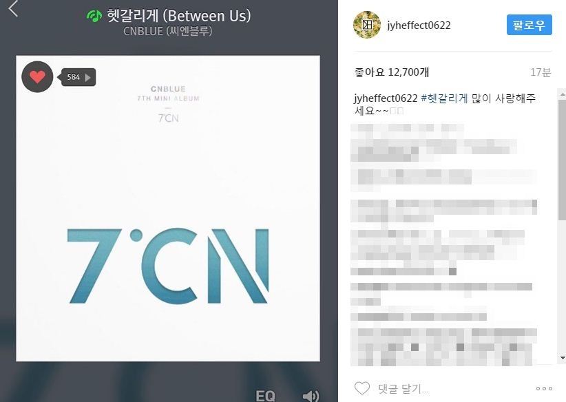 [아시아경제 디지털뉴스본부 조아영 기자] 그룹 씨엔블루의 멤버 정용화가 신곡 홍보에 나섰다.정용화는 자신의 인스타그램에 20일 오후 “헷갈리게 많이 사랑해주세요”라는 글과 함께 한 장의 사진을 올렸다.공개된 사진 속에는 신곡 ‘헷갈리게’의 음원이 재생중인 화면이 담겨 있다.팬들은 “노래 엄청 좋아요(vic***)”, “CNBLUE는 컴백 할 때마다 더 큰 '물건'을 가지고 돌아와요(cho***)”, “너무 좋아 믿고 듣는 씨엔블루!!(suj***)”, “노래 너무 좋아요! 계속 계속 듣고 있어요!(han***)” 등의 반응을 보이고 있다.한편 씨엔블루는 미니앨범 7집 ‘7℃N(7도씨엔)’을 통해 11개월 만에 컴백했다. 타이틀곡 ‘헷갈리게’는 정용화의 자작곡으로 경쾌한 리듬의 전반부에서 록 사운드가 강한 후렴구로 이어지는 독특한 전개의 팝록이다.씨엔블루는 21일 ‘7℃N’ 스페셜반의 예약 판매를 시작하며, 오는 23일 Mnet ‘엠카운트다운’에서 최초 컴백 무대를 갖는다.디지털뉴스본부 조아영 기자 joa0@asiae.co.kr<ⓒ세계를 보는 창 경제를 보는 눈, 아시아경제(www.asiae.co.kr) 무단전재 배포금지>
