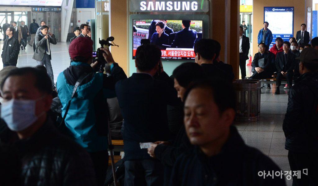 [아시아경제 문호남 수습기자] 박근혜 전 대통령이 검찰 소환 조사를 받는 21일 서울 용산구 서울역에서 시민들이 TV 생중계를 시청하고 있다.문호남 수습기자 munonam@asiae.co.kr<ⓒ세계를 보는 창 경제를 보는 눈, 아시아경제(www.asiae.co.kr) 무단전재 배포금지>
