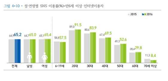 [아시아경제 안하늘 기자] 남성과 여성 중 누가 더 소셜네트워크서비스(SNS)를 이용할까? 성별로는 큰 차이는 없었으나 카카오스토리에서는 여성, 페이스북에서는 남성의 이용률이 더 높았다.21일 미래창조과학부와 한국인터넷진흥원(KISA)이 발표한 '2016년 인터넷이용실태조사 최종보고서'에 따르면 우리나라 만6세 이상 인구 인터넷이용자 10명 중 6명(65.2%)은 최근 1년 이내에 SNS를 이용한 것으로 나타났다.성별에 관계없이 비슷한 수준(남성 65.0%, 여성 65.4%)으로 조사됐다. 연령대별로는 20대(91.5%)에서 가장 높았고, 다음으로 30대(83.9%), 40대(69.5%), 6-19세(57.5%) 등의 순이었다.주로 이용하는 SNS 서비스는 '카카오스토리'(71.1%)로 조사됐으며, '페이스북'(61.4%), '네이버밴드'(42.1%), '인스타그램'(23.4%), '네이버 카페'(11.1%), '네이버 블로그'(10.6%) 등의 순이었다.카카오스토리는 남성(67.9%)보다 여성(74.4%)에서 높은 이용률을 보인 한편, 페이스북은 여성(57.9%)보다 남성(64.7%)에서 높은 이용률을 보였다. 연령대별 분석 결과, 카카오스토리는 40대(77.9%), 페이스북은 20대(81.8%)에서, 네이버 밴드는 50대(57.6%)에서, 인스타그램은 20대(36.9%)에서 타 연령 대비 이용률이 상대적으로 높게 나타났다.주평균 SNS 이용빈도는 19.6회(하루 평균 2.8회)로 조사됐다. '5회 미만'이라는 의견이 36.9%로 가장 높게 나타났다. 다음으로 '20회 이상'(30.4%), '5-10회 미만'(17.6%), '10-20회 미만'(15.1%)등의 순으로 조사됐다. 일주일에 평균 1시간 3분 SNS를 이용하는 것으로 나타났으며, 적어도 일주일에 '1시간 이상'(1-2시간 미만 21.4%, 2시간 이상 16.8%) 이용한다는 의견은 38.2%였다. SNS 이용자 10명 중 8명(84.0%)이 '친교·교제를 위해서' SNS를 이용한다고 답했고, '취미·여가활동 등 개인적 관심사 공유를 위해서'(49.1%), '타인이 게시한 콘텐츠를 살펴보기 위해서'(45.1%), '정보나 지식, 사건사고 등을 공유하기 위해서' (41.1%) 등의 순으로 나타났다.이용자의 절반 이상(56.8%)이 SNS가 삶에 긍정적인 영향을 미친다고 인식하고 있었다. 반면 '부정적이다'라는 인식은 3.5%에 그쳤고, '보통이다'라는 중립적 의견은 39.7%로 조사됐다.SNS 비이용자 10명 중 7명(76.5%)은 '필요가 없어서' SNS를 이용하지 않는 것으로 나타났다. '모르는 사람과 연결되는 것이 불편해서'(27.0%), '사생활 및 개인정보 유출이 우려되어서'(15.0%), '이용할 자신이 없거나 방법을 몰라서'(12.9%) 등의 순으로 나타났다.안하늘 기자 ahn708@asiae.co.kr<ⓒ세계를 보는 창 경제를 보는 눈, 아시아경제(www.asiae.co.kr) 무단전재 배포금지>