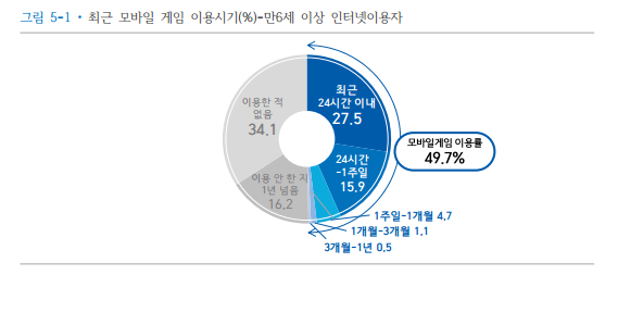 [아시아경제 안하늘 기자] 우리나라 인터넷 이용자 두 명 중 한 명이 모바일 게임 이용자로 나타났다. 이들 중 60%는 일주일에 5회 이상 즐겼으며, 평균 이용시간은 1시간 54분으로 조사됐다. 21일 미래창조과학부와 한국인터넷진흥원(KISA)이 발표한 '2016년 인터넷이용실태조사 최종보고서'에 따르면 만6세 이상 인터넷이용자의 모바일 게임 이용률(최근 1년 이내 모바일 게임 이용자의 비율)은 49.7%로 나타났다. 세부적으로는 최근 24시간 이내 모바일 게임을 이용했다는 의견이 27.5%로 가장 높은 수준을 보였다.모바일 게임 이용률은 여성(44.0%)에 비해 남성(55.2%)이 높았고, 연령대별로는 6-19세 미성년층이 73.0%로 타 연령대비 가장 높은 수준을 보였다. 20대(71.2%), 30대(59.0%), 40대(44.1%) 등의 순으로 높았다.모바일 게임 이용자의 절반 이상(59.5%)이 일주일에 5회 이상 모바일 게임을 이용하는 것으로 나타났으며, 주평균 모바일 게임 이용빈도는 12.6회(하루 평균 1.8회)로 조사됐다.모바일 게임 이용시간은 일주일 기준 '1시간 이상' 이라는 의견이 55.3%로 과반을 차지했다. 주평균 모바일 게임 이용시간은 1시간 54분(하루 평균 16분)이다.모바일 게임 이용자가 가장 많이 이용하는 게임 종류는 '버블슈팅·캐주얼게임'(48.8%)이었으며, '카드·바둑·스도쿠 게임'(32.4%), '레이싱 게임'(29.3%), '전략·매니지먼트 시뮬레이션 게임'(28.7%) 등의 순으로 높게 나타났다.만12세 이상 모바일 게임 이용자의 10명 중 7명(71.1%)은 '모바일 게임을 하면 스트레스가 해소된다'는데 동의했고, 이용자의 절반 이상이 '모바일 게임을 하면서 성취감을 느낀다'(57.8%)고 인식하는 것으로 조사됐다.반면 '모바일 게임은 학업, 업무에 방해가 된다'(30.1%), '모바일 게임을 하는 것은 시간낭비라고 생각한다'(24.7%) 등 모바일 게임에 대한 부정적인 인식은 30% 수준을 보였다.사진=KISA
