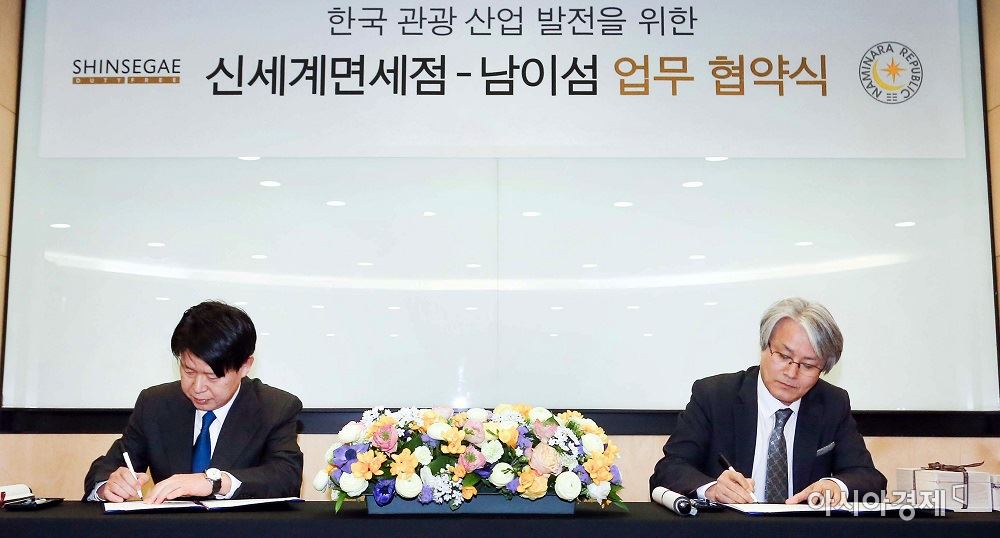 손영식 신세계디에프 대표(왼쪽)와 전명준 남이섬 대표가 업무 협약서에 서명하고 있다.