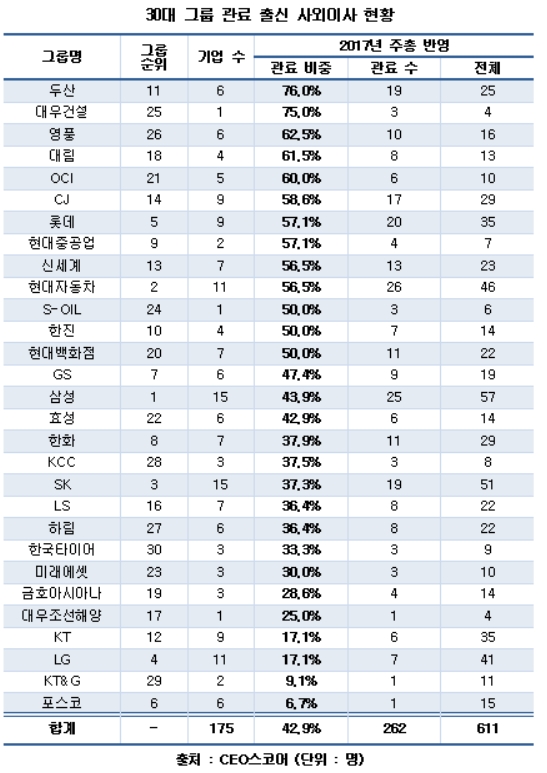 [아시아경제 박미주 기자]‘관피아’ 논란에도 30대 그룹의 관료 출신 사외이사 비중이 올해 주주총회를 거치면서 더욱 높아진 것으로 나타났다.22일 기업 경영성과 평가사이트 CEO스코어에 따르면 올해 주주총회를 실시한 사업보고서 제출 30대 그룹 계열사 중 사외이사를 선임해야 하는 175개사의 관료 출신 선임 현황을 전수 조사한 결과 전체 사외이사 611명 중 관료 출신은 42.9%(262명)로 절반에 육박했다. 지난해 3분기 말 195개사 637명의 사외이사 중 관료 출신이 41.1%(262명)였던 것보다 1.8%포인트 높아졌다.학계 출신은 30.8%(188명)로 지난해와 동일했고, 재계(13.1%), 언론(3.4%), 공공기관(2.8%), 법조(2.1%), 정계(0.3%) 출신은 비중이 소폭 하락했다.가장 큰 비중을 차지하는 관료 출신은 법원·검찰(26.0%)과 청와대(24.0%) 등 권력기관 출신으로 전체의 절반을 차지했다. 이어 국세청·관세청(16.4%), 공정거래위원회(8.0%), 기획재정부(7.3%), 금융감독원(4.2%), 산업통상자원부(2.7%), 감사원(1.9%) 등 감독당국과 경제부처 출신 선호도가 높았다.이번 조사에서 상장사가 없는 부영은 제외했고, 여러 부처나 기관에서 근무한 인사는 근무기간이 가장 오래되고 직급이 높은 곳을 출신 기준으로 삼았다.그룹별로 보면 두산(76.0%)과 대우건설(75.0%)이 관료출신 사외이사를 가장 선호하는 것으로 나타났다. 영풍(62.5%), 대림(61.5%), OCI(60%)도 관료 출신 비중이 60%를 넘었고, CJ(58.6%), 롯데(57.1%), 현대중공업(57.1%), 현대차(56.5%), 신세계(56.5%), 현대백화점(50.0%), 한진(50.0%), S-Oil(50.0%) 역시 50%를 넘었다. 부영을 제외한 29개 그룹 중 13곳(44.8%)이 사외이사 과반을 관료 출신으로 채운 셈이다.반면 포스코(6.7%)와 KT&G(9.1%)는 관료 출신 사외이사 비중이 10% 미만이었다. LG(17.1%), KT(17,1%), 대우조선해양(25.0%), 금호아시아나(28.6%)도 낮은 축에 속했다. 재계 1위 삼성은 43.9%였다.기업별로는 16곳이 사외이사 전원을 관료출신으로 채웠다. OCI그룹의 삼광글라스(1명)·유니드(1명)· 유니온(1명) 등 3개사, 두산그룹의 두산인프라코어(5명)·두산건설(4명) 2개사, 영풍그룹의 고려아연(5명)·코리아써키트(1명) 2개사, 현대백화점그룹의 현대그린푸드(3명)·현대홈쇼핑(3명) 2개사 외에 삼성카드(4명), CJ헬로비전(4명), 신세계인터내셔날(3명), 롯데정밀화학(2명), 삼호(2명), 한진(2명), 진흥기업(1명)이 그에 해당한다.관료출신 사외이사가 전무한 곳은 46곳이었다. LG디스플레이, LG이노텍, LS네트웍스, KCC건설, KTcs, SKC, SK D&D, 롯데푸드, 미래에셋생명, 신세계I&C, 제일기획, 포스코강판, 포스코대우, 한화갤러리아타임월드, 현대리바트 등이다.박미주 기자 beyond@asiae.co.kr<ⓒ세계를 보는 창 경제를 보는 눈, 아시아경제(www.asiae.co.kr) 무단전재 배포금지>