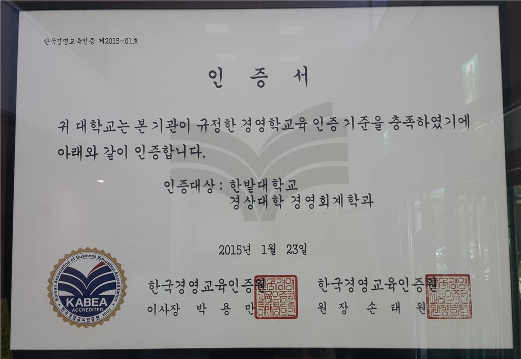 한밭대는 올해 사단법인 한국경영학교육인증원으로부터 ‘경영학교인증’ 3년 연장 승인을 받았다. 한밭대 제공