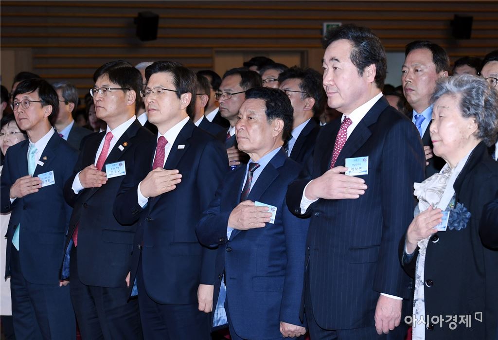 [아시아경제 노해섭 기자]‘2017 세계물의 날’ 기념식이 환경부와 국토교통부 공동 주관으로 22일 오후 광주광역시 서구 김대중컨벤션센터 컨벤션홀에서 열린 가운데 황교안 대통령 권한대행, 조경규 환경부 장관, 윤장현 광주광역시장, 이낙연 전남도지사, 이은방 광주광역시의장 등 주요 내빈들이 국민의례를 하고 있다.