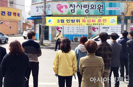 "내 주변 대피소 찾기 훈련 및 방독면 착용 교육"[아시아경제 노해섭 기자]영암군(군수 전동평)은 23일 다중이용시설인 영암공영버스터미널 주변에서 3월 민방위 특성화 훈련으로 내 주변 대피소 찾기 훈련 및 방독면 착용 교육을 실시했다. 이번 훈련은 공공용으로 지정된 영암군 관내 주민대피시설 위치안내 및 홍보를 통해 유사시 인근 주민들을 신속하게 대피시키고, 주민안전을 확보하는데 목적을 두고 실시했다. 또한, 인근 대피시설(영암군보건소 지하대피소)로 대피한 주민들에게 화생방 사태 발생에 대비한 방독면 착용 교육을 실시하고, 주민들이 직접 착용해 보는 기회도 가졌다 영암군 관계자는 “지역·직장 특성에 맞는 재난맞춤형 훈련과 민방공 대피훈련 등 민방위 훈련을 지속적으로 실시할 계획”이라며 “군민안전과 재산보호를 위해서는 주민들의 자발적인 참여가 무엇보다 중요하다”고 말했다.노해섭 기자 nogary@<ⓒ세계를 보는 창 경제를 보는 눈, 아시아경제(www.asiae.co.kr) 무단전재 배포금지>