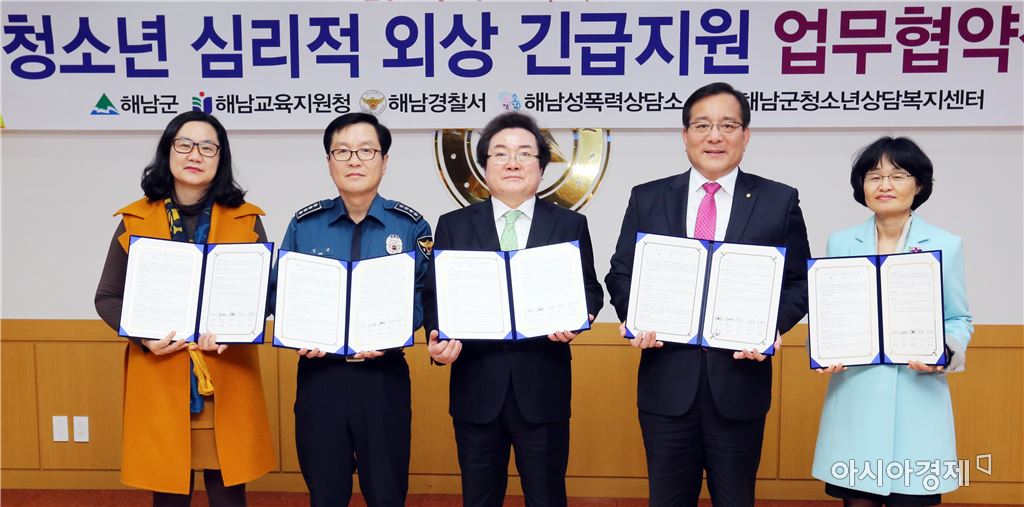 "위기상황 청소년, 지역사회가 함께 돕는다" [아시아경제 노해섭 기자]해남군이 청소년의 위기사항에 신속히 대응하고, 심리적 외상을 치료하기 위한 긴급지원팀을 구성했다. 해남군은 지난 22일 해남교육지원청, 해남경찰서, 해남성폭력상담소, 해남군청소년상담복지센터 등 5개 기관과 함께 청소년의 심리적 외상을 긴급지원하기 위한 업무협약을 체결했다. 이번 협약을 통해 군은 유관기관과 긴급지원 시스템을 구축해 불시에 발생하는 다양한 사건·사고로부터 청소년들을 보호하고, 심리적 외상 예방을 위해 신속히 대응해 나가기로 했다. 이에따라 학교폭력과 가정폭력, 각종 재해 등 다양한 사고의 목격자 및 당사자가 된 청소년에 대한 상담 지원과 함께 안전확보, 실무자 지원, 지역사회 연계 등의 활동을 펼치게 된다. 군 관계자는 “불의의 사고를 경험한 청소년들은 외상 후 스트레스 장애로 발전할 가능성이 크기 때문에, 청소년들이 2차 피해를 입지 않도록 심리적 외상 긴급지원팀을 통해 보호해 나갈 계획”이라고 밝혔다. 노해섭 기자 nogary@<ⓒ세계를 보는 창 경제를 보는 눈, 아시아경제(www.asiae.co.kr) 무단전재 배포금지>
