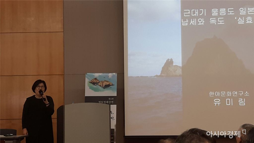 유미림 소장은 울릉도 거주 일본인들이 독도의 강치를 일본으로 수출하면서 냈던 수출세를 근거로 한국의 실효적 지배를 설명했다. [사진=김세영 기자]