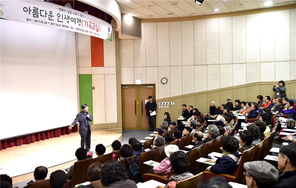 [아시아경제 박종일 기자] 김성환 노원구청장이 24일 오후 2시 노원구청 소강당에서 열린 아름다운 인생여행(가곡교실) 교육장에서 참가 어르신들에게 인사말을 했다. 이번 교육은 24일부터 다음달 21일까지 매주 금요일 오후 1시30~5시 운영, 건강한 인생 설계와 풍요로운 삶을 위한 프로그램들로 진행된다. 박종일 기자 dream@asiae.co.kr<ⓒ세계를 보는 창 경제를 보는 눈, 아시아경제(www.asiae.co.kr) 무단전재 배포금지>