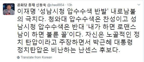 [아시아경제 디지털뉴스본부 최누리 기자] 신동욱 공화당 총재가 성남시청 압수수색을 비판하는 이재명 성남시장에 대해 “난센스 후보다”고 비판했다. 신동욱 총재는 26일 자신의 트위터를 통해 “이재명 ‘성남시청 압수수백 반발’ 내로남불의 극치다”고 말했다. 이어 신 총재는 “청와대 압수수색은 찬성이고 성남시청 압수수색은 반대 ‘내가 하면 로맨스 남이 하면 불륜 꼴’이다. 자신은 노골적인 정치탄압이라고 주장하면서 박근혜 전 대통령의 정치 탄압은 비난하는 난센스 후보다”고 지적했다. 앞서 이재명 시장은 이날 “분명히 경고한다. 검찰은 저에 대한 정치탄압과 정략적인 민주당 경선 개입을 중단하라. 국민의 심판을 면치 못할 것이다. 노골적 정치탄압과 선거개입을 의심하지 않을 수 없다”며 검찰의 성남시청 압수수색을 비판했다. 검찰은 이 시장 반발에 대해 “압수수색은 민주당 경선 일정과 무관하다”며 “중앙선거관리위원회의 고발과 동시에 언론에 보도됐다”면서 “증거확보를 위해 신속한 압수수색이 필요했다. 적법한 절차를 거쳤다”고 해명했다. 앞서 검찰은 지난 24일 성남시청 시간선택임기제 공무원 A씨가 소속된 사무실과 정보통신부서 등을 압수수색했다. A씨는 자신의 소셜네트워크서비스(SNS)에 ‘촛불 개혁과제를 가장 잘한 후보는 이재명이다’라는 게시물과 영상 131건을 공유한 혐의를 받고 있다. 중앙선거관리위원회는 지난 23일 이 시장의 선거운동을 한 혐의로 A씨를 검찰에 고발했다. 공직선거법 제9조에는 공무원이 선거운동을 할 수 없으며 중립의무를 지켜야 한다고 규정되어 있다.디지털뉴스본부 최누리 기자 asdwezx1@asiae.co.kr<ⓒ세계를 보는 창 경제를 보는 눈, 아시아경제(www.asiae.co.kr) 무단전재 배포금지>