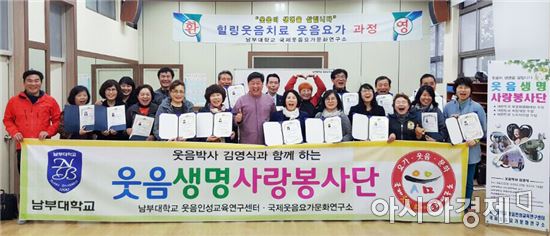 [아시아경제 노해섭 기자]남부대학교 웃음인성교육연구소(소장 김영식 무도경호학과 교수)는 25일 웃음생명사랑 봉사단을 만들었다.웃음생명사랑봉사단(단장 노경수)은 남부대 평생교육원에서 웃음요가와 웃음치료를 배운 수강생들이 중심이 되어 창단되었다.봉사단 30여명은 웃음을 통해 생명사랑을 알리는 봉사를 할 예정이다. 최근에는 요양원·옥과시니어클럽 등에서 웃음공연 봉사를 했다. 노해섭 기자 nogary@ <ⓒ세계를 보는 창 경제를 보는 눈, 아시아경제(www.asiae.co.kr) 무단전재 배포금지>