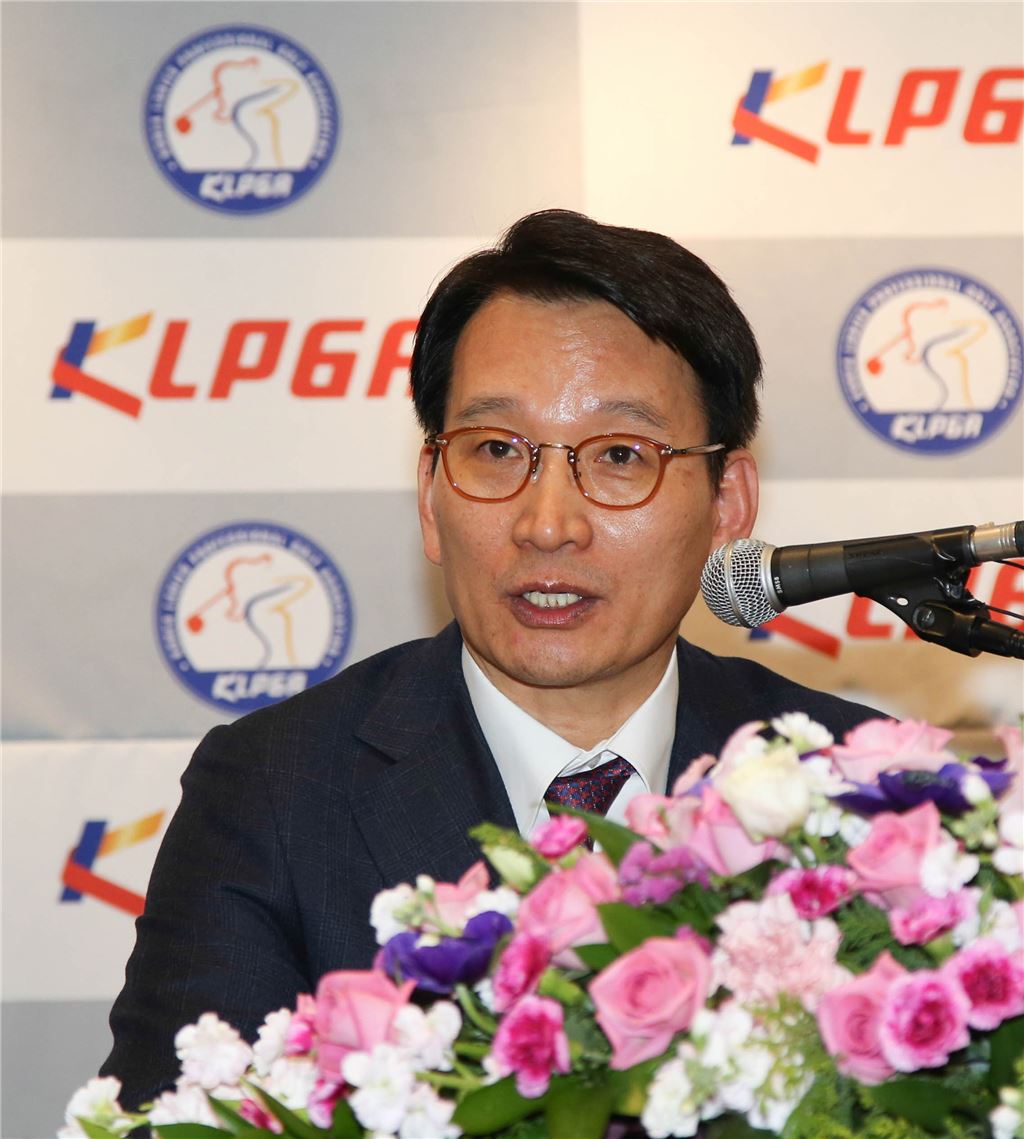 김상열 호반건설 회장이 제13대 KLPGA 회장에 취임한 뒤 포부를 밝히고 있다. 사진=KLPGA