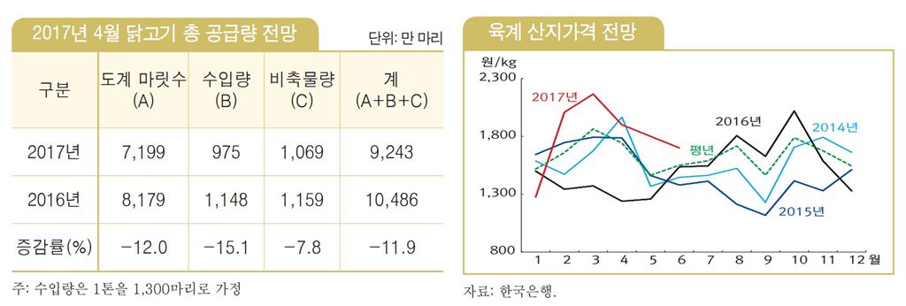 [아시아경제 오종탁 기자] 다음달 닭고기와 돼지고기 가격이 여전히 1년 전보다 높은 가격대를 형성할 전망이다. 한우값만 약세를 나타낼 것으로 관측된다. 28일 한국농촌경제연구원(KREI) 축산관측 월보에 따르면 4월 육계 1kg 산지가는 닭고기 공급 감소 영향에 전년 동월(1240원)보다 38.3~51.7% 상승하는 반면 이달보다는 하락한 1800원~2000원으로 관측된다.도계 마릿수와 수입·재고 감소에 다음달 닭고기 공급량은 1년 전보다 감소할 것으로 KREI는 내다봤다. 총 공급량이 11.9% 줄어든 9243만마리 수준으로 전망된다.최근 브라질산 부패 닭고기 파동과 관련, KREI는 "향후 국내 닭고기 수급에 미치는 영향은 크지 않을 것으로 본다"고 밝혔다. KREI는 "부분육이 아닌 마리로 유통되는 국내산 닭고기 시장에 미치는 영향은 제한적"이라며 "식품 안전성에 대한 불신으로 전체 닭고기 소비가 감소한다면 가격이 떨어질 것으로 예상된다"고 설명했다. 그러면서 "수입 닭고기 검역 강화와 안전성 홍보로 소비자의 안심을 유도할 필요가 있다"고 덧붙였다. 이달 육계 산지가는 고병원성 조류인플루엔자(AI)로 인한 공급 감소 영향에 전년 동월 대비 올랐다가 중순 이후 하락세를 보였다. 정부의 가격 안정 대책 효과가 나타났기 때문이다. 지난 1~24일 기준 육계 산지가는 생체 kg당 2147원으로 1년 전(1372원)보다 56.5%, 평년(1864원)보다 15.2% 상승했다. 소비자 가격은 전년 동월 대비 1.2% 오른 kg 당 5613원이다.(정보그림=한국농촌경제연구원)