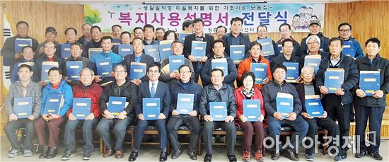 "28일 복지 사용설명서 발간 49개 마을에 배포"[아시아경제 노해섭 기자]장흥읍행정복지센터(읍장 김광렬)는 28일 장흥읍 회의실에서 ‘복지 사용설명서’를 발간해 49개 마을에 배포했다. ‘복지 사용설명서’는 주민들이 가장 궁금해 하는 분야의 정보들을 집약한 생활밀착형 마을복지의 기초자료집이다. 자칫 정보에 소외될 수 있는 사회적 취약계층에게 산발적으로 흩어져 있는 복지정보를 한 곳에 모아, 맞춤형 복지에 대한 접근성을 높이기 위해 제작됐다. 주요내용으로 ▲맞춤형복지 ▲기초생활 ▲노인복지 ▲장애인복지 ▲여성복지 ▲아동·보육 ▲모자보건 ▲방문보건 등 주민생활과 밀접한 복지정보를 담고 있다. ‘복지 사용설명서’는 주민 누구나 열람할 수 있어, 복지서비스가 누수 없이 전달하는 정보지와 맞춤형 복지의 길라잡이 역할을 할 것으로 기대하고 있다. 김광렬 장흥읍장은 이날 발간사를 통해 “찾아가는 맞춤형 복지를 더욱 내실화 해 발로 뛰는 현장복지행정을 추진 할 것”이라며 “사람중심의 복지를 통해 주민 행복 1번지 장흥 만들기에 더욱 노력하겠다”고 말했다.노해섭 기자 nogary@<ⓒ세계를 보는 창 경제를 보는 눈, 아시아경제(www.asiae.co.kr) 무단전재 배포금지>