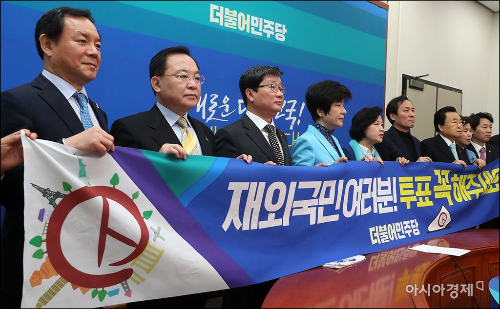 [아시아경제 윤동주 기자] 추미애 더불어민주당 대표와 우상호 원내대표 등 지도부가 29일 국회에서 '재외국민 투표 호소 캠페인'을 갖고 있다.윤동주 기자 doso7@asiae.co.kr<ⓒ세계를 보는 창 경제를 보는 눈, 아시아경제(www.asiae.co.kr) 무단전재 배포금지>