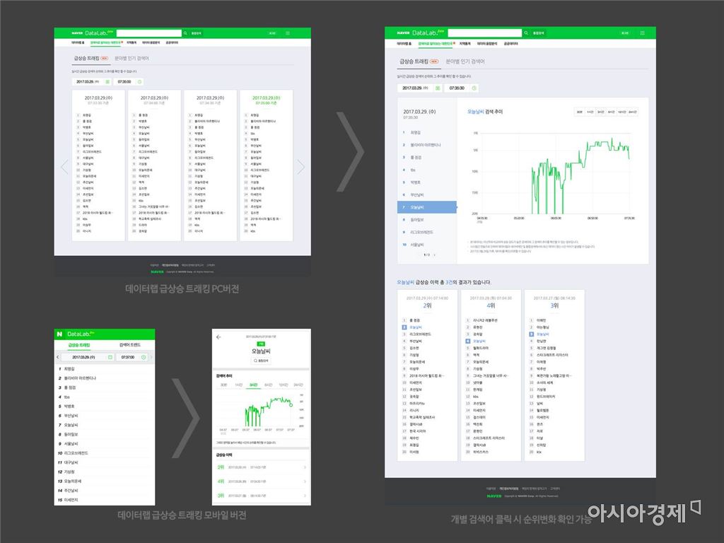 [아시아경제 한진주 기자] 네이버(NAVER)가 데이터랩에서 실시간 급상승 검색어 차트의 변화 흐름을 볼 수 있는 히스토리를 제공한다.29일 네이버는 데이터랩에 '급상승 트래킹' 섹션을 추가해 이 실시간 급상승 검색어(이하 실검) 차트 히스토리를 제공한다고 밝혔다.이번에 신설된 '급상승 트래킹' 섹션에서는 실급검 차트가 어떻게 변화하는지를 30초 단위로 선택해서 볼 수 있다. 데이터랩은 차트 내 개별 검색어들의 최근 24시간 내 순위 변화도 30초 단위의 그래프로 제공한다. 실급검 차트는 3월 29일 0시 이후 데이터부터 제공된다.네이버 첫 화면의 실검 차트도 바뀐다. 먼저 차트 우측에 알아보기 어려웠던 검색량 상승폭 대신 데이터랩으로 이동할 수 있는 아이콘이 배치된다. 데이터랩으로 이동해야만 개별 검색어들의 순위가 어떻게 변화했는지 확인할 수 있다. 네이버는 추후 실검 섹션에 개별 검색어를 찾아 볼 수 있는 검색 기능도 추가할 예정이다. 네이버는 지난 1월부터 사용자 신뢰와 투명성 확보를 위해 는 실검 시스템을 개편해왔다. 다음달 중에는 실검과 함께 배치된 뉴스토픽 차트의 갱신 주기를 변경할 계획이다. 네이버는 데이터랩 서비스의 모바일 버전도 출시했다. 모바일 버전 내에 '급상승 트래킹' 섹션과 특정 검색어들의 검색량 변화를 주간 단위로 비교해볼 수 있는 '검색어 트렌드' 섹션을 우선 공개했다. 추후 PC 버전의 다양한 기능들을 모바일에 맞게 최적화해 공개할 계획이다. 네이버는 연내 검색량의 추이 변화를 확인할 수 있는 ‘검색어 트렌드’ 섹션의 조회 기간을 기존 주간에서 일간 단위로 확대한다. 성별·연령별로 세분화해서 조회할 수 있는 기능도 제공할 계획이다. 데이터랩을 담당하고 있는 김원용 네이버 리더는 "네이버 데이터랩은 중소사업자 등 모든 사용자들이 네이버가 보유한 검색 데이터를 효과적으로 다룰 수 있게 하는 데이터 플랫폼을 지향한다"며 "앞으로도 사용자들의 생활에 도움이 될 수 있는 데이터들을 지속적으로 공개해 나갈 것"이라 말했다. 한성숙 네이버 대표는 "방대한 데이터를 쉽게 활용할 수 있도록 제공하는 것은 사용자들에게 더욱 가치있는 정보를 제공할 수 있을 뿐 아니라, 기술 플랫폼의 근간인 사용자 신뢰도를 높일 수 있다"며 "네이버 각 영역에서 더욱 다양한 데이터들을 공개하려는 노력을 강화하겠다"고 밝혔다.한진주 기자 truepearl@asiae.co.kr<ⓒ세계를 보는 창 경제를 보는 눈, 아시아경제(www.asiae.co.kr) 무단전재 배포금지>