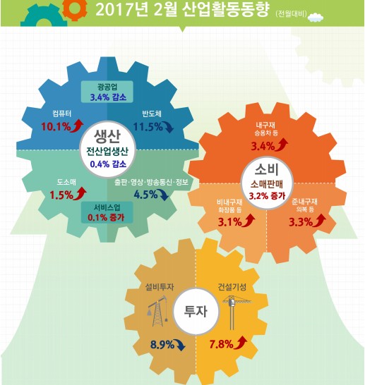 [아시아경제 이지은 기자]얼어붙었던 소비가 4개월만에 꿈틀대기 시작했다. 산업생산과 투자는 그동안의 호황에 따른 기저효과로 감소했다. 통계청이 31일 발표한 '2월 산업활동동향'에 따르면 지난달 소매판매는 전월 대비 3.2% 증가했다. 지난해 10월(4.2%) 이후 계속 전월대비 하락했던 소비가 4개월만에 상승 반전한 것이다. 화장품 등 비내구재(3.1%), 승용차 등 내구재(3.4%), 의복 등 준내구재(3.3%) 판매가 모두 늘어난 것이 원인이다. 박병선 통계청 사무관은 "설 등 계절적 특수요인을 제외하고서도 전월 대비 3.2% 증가했다"며 "승용차의 경우 1월 판매가 나빴던 데 대한 기저효과와 2월 신차 발매 효과가 모두 작용했다"고 말했다. 전년동월대비로 봐도 소매판매는 승용차 등 내구재(7.5%) 판매가 늘면서 0.5% 증가했다. 소매업태별로는 무점포소매(17.2%), 편의점(13.2%) 등이 전년 동월대비 증가했으나 슈퍼마켓(-10.4%), 백화점(-5.6%) 등은 감소했다. 전산업생산은 광공업생산 부진으로 인해 전월 대비 0.4% 감소했다. 광공업생산은 전월 대비 3.4% 감소하며 전체 전산업생산을 1.12%포인트 끌어내렸다. 컴퓨터(10.1%) 등에서는 증가했으나, 반도체가 11.5%, 자동차가 6.1% 감소했기때문이다. 어운선 통계청 산업동향과 과장은 "중국 스마트폰 업체들이 판매둔화로 인해 재고관리에 들어가면서 생산이 줄어든 것"이라고 말했다. 서비스업생산은 도소매(1.5%)와 금융·보험(1.3%) 등에서 늘면서 전월 대비 0.1% 증가했다.설비투자 역시 기계류(-8.5%), 운송장비(-9.9%) 투자가 모두 줄면서 전월 대비 8.9% 감소했다. 박 사무관은 "삼성 평택 반도체 투자가 늘면서 지난해 11~1월까지 반도체 제조장비 투자가 늘었는데, (이번 달은) 이에 따른 기저효과가 나타난 것으로 보인다"고 말했다. 건설기성은 건축(5.2%) 및 토목(15.1%) 공사 실적이 모두 늘면서 전월 대비 7.8% 증가했다. 건설수주는 건축에서 감소했으나 발전·통신·항만 등 토목(171.2%)에서 늘면서 전년동월대비 22.6% 증가했다. 현재 경기를 나타내는 동행지수 순환변동치는 내수출하지수, 광공업생산지수 등이 감소했으나 서비스업생산지수, 건설기성액 등이 증가하며 전월대비 0.1포인트 상승했다. 미래 경기를 나타내는 선행지수 순환변동치는 수출입물가비율이 감소했으나 기계류내수출하지수, 건설수주액 등이 증가하며 전월대비 0.2포인트 상승했다. 이지은 기자 leezn@asiae.co.kr<ⓒ세계를 보는 창 경제를 보는 눈, 아시아경제(www.asiae.co.kr) 무단전재 배포금지>