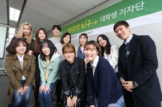 '빌려쓰는 지구스쿨 대학생 기자단'으로 선발된 대학생들이 환하게 웃으며 기념촬영을 하고 있다.