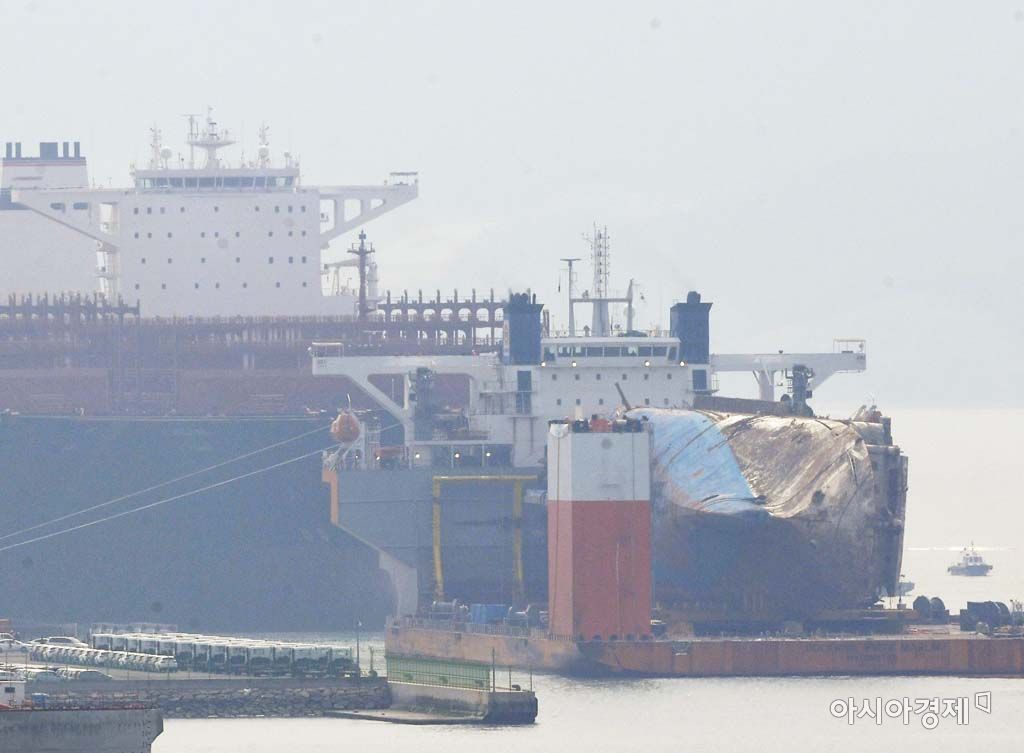 [아시아경제 백소아 기자] 31일 세월호 선체를 실은 반잠수식 선박 화이트마린호가 전라남도 목포시 목포신항만에 도착해 거치작업을 준비하고 있다.백소아 기자 sharp2046@asiae.co.kr<ⓒ세계를 보는 창 경제를 보는 눈, 아시아경제(www.asiae.co.kr) 무단전재 배포금지>