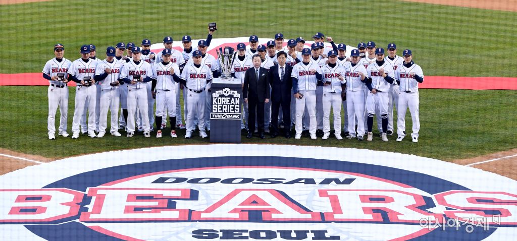 [아시아경제 김현민 기자]프로야구 한화 이글스와 두산 베어스의 2017 KBO리그 개막경기가 31일 잠실구장에서 열렸다. 지난 시즌 챔피언 두산 선수들이 우승 반지 전달식을 하고 있다.
