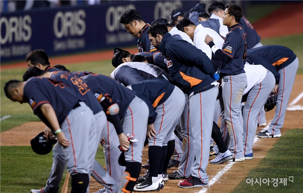 [아시아경제 김현민 기자]프로야구 한화 이글스와 두산 베어스의 2017 KBO리그 개막경기가 31일 잠실구장에서 열렸다. 한화 선수들이 0-3으로 진 뒤 팬들에게 인사하고 있다. 김현민 기자 kimhyun81@asiae.co.kr<ⓒ세계를 보는 창 경제를 보는 눈, 아시아경제(www.asiae.co.kr) 무단전재 배포금지>