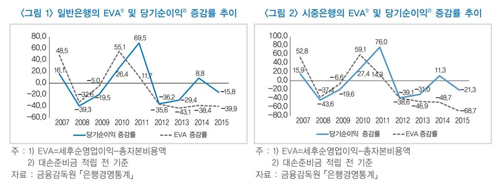 [아시아경제 정현진 기자] 지난해 국내 시중은행과 지방은행 등 일반은행의 당기순이익이 급증한 것과 관련해 은행의 영업 환경이 개선됐다고 보기 어렵다는 지적이 나왔다.김우진 한국금융연구원 선임연구위원은 2일 발표한 '경제적 부가가치(EVA)를 활용한 국내 일반은행의 최근 실적 평가' 보고서를 통해 이같이 밝혔다.앞서 지난달 초 금융감독원 발표에 따르면 지난해 국내 일반은행(시중은행 및 지방은행)의 당기순이익은 전년대비 27.7% 증가한 6조5000억원을 기록했다. 일반은행 당기순이익이 6조원을 넘어선 것은 2013년 이후 처음이다.김 연구위원은 "추세적 개선이라 판단하기엔 무리가 있다"며 "당기순이익 지표가 산출과정이 자의적인 데다 일회성 요인도 반영할 수 있기 때문에 해석에 유의할 필요가 있다"고 지적했다.예를 들어 유가증권 처분이익의 경우 영업활동과는 직접적인 관계가 없는 일회성 요인이지만 당기순이익에 포함된다는 것이다.김 연구위원은 영업활동을 통해 창출한 순가치의 증가분을 의미하는 EVA(경제적 부가가치) 지표를 살펴야한다고 지적했다. EVA는 세후순영업이익에서 투입된 자본에 대한 자본비용을 차감한 수치로 영업과 직접적인 관련이 없는 항목은 조정된다.국내은행의 EVA와 당기순이익 추이를 보면 2007년부터 2012년까지는 비슷한 방향성을 보인다. 하지만 국내 은행의 수익성이 급격히 하락한 2012년 이후부터 두 지표간 차이가 드러난다.2014년의 경우 일반은행 당기순이익은 전년대비 8.8%, 시중은행은 11.3% 증가했으나 같은 기간 EVA는 38.4%, 48.7% 감소한 것으로 나타났다.2015년에도 일반은행 당기순이익은 전년대비 15.8% 감소했지만 EVA는 39.9% 줄어 감소폭은 당기순이익에 비해 더욱 커졌다.김 연구위원은 "2011년 이후 국내은행의 총이익이 감소하거나 정체하는 모습과 일치하는 현상"이라며 "이 기간 영업과 관련된 실질적인 수익이 줄고 있음을 의미한다"고 설명했다.이어 "작년에 한 시중은행은 대규모 희망퇴직 실시를 은행의 체질개선을 위한 일회성 비용으로 활용한 적 있다"며 "지난해 국내 일반은행의 실적 호전을 지나치게 긍정적으로 해석하기보단 보수적인 태도를 견지할 필요가 있다"고 말했다.정현진 기자 jhj48@asiae.co.kr<ⓒ세계를 보는 창 경제를 보는 눈, 아시아경제(www.asiae.co.kr) 무단전재 배포금지>