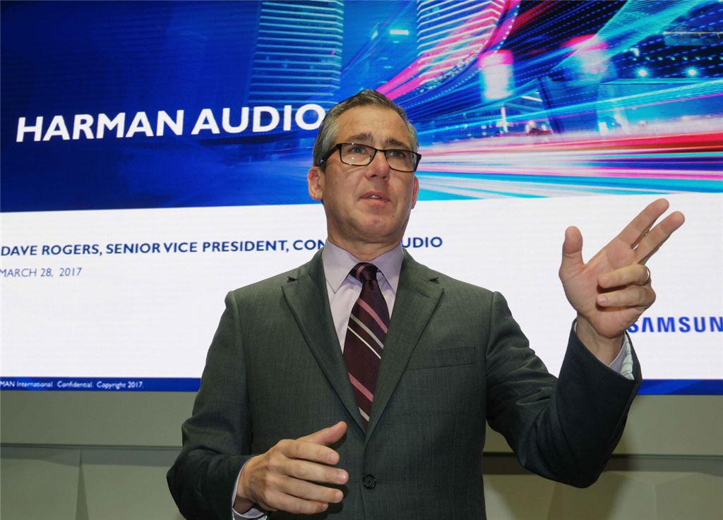 지난달 28일(현지시간) 미국 뉴욕의 하만 '플래그십 스토어'에서 데이브 로저스(Dave Rogers) 하만 컨슈머 오디오 사업 담당 전무가 해당 사업 전반에 대해 소개하고 있다.(사진=삼성전자 제공)