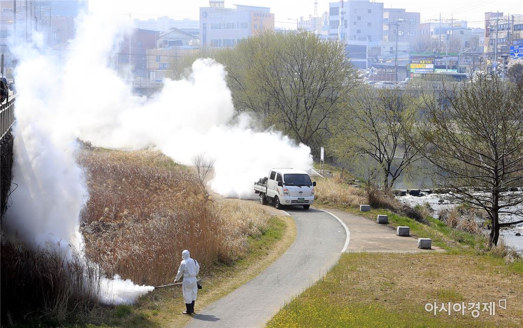 [아시아경제 노해섭 기자]한낮의 기온이 20도를 웃돌면서 각종 전염병과 모기퇴치 예방을 위해 광주 북구 보건소 방역반원들이 4일 임동 광주천 일대 산책로에서 방역차량을 이용해 방역을 실시하고 있다. 북구는 흰줄숲모기가 주로 활동하는 4월부터 10월까지 주기적으로 취약지를 대상으로 방역을 실시 할 계획이다. 사진제공=광주시 북구 <ⓒ세계를 보는 창 경제를 보는 눈, 아시아경제(www.asiae.co.kr) 무단전재 배포금지>