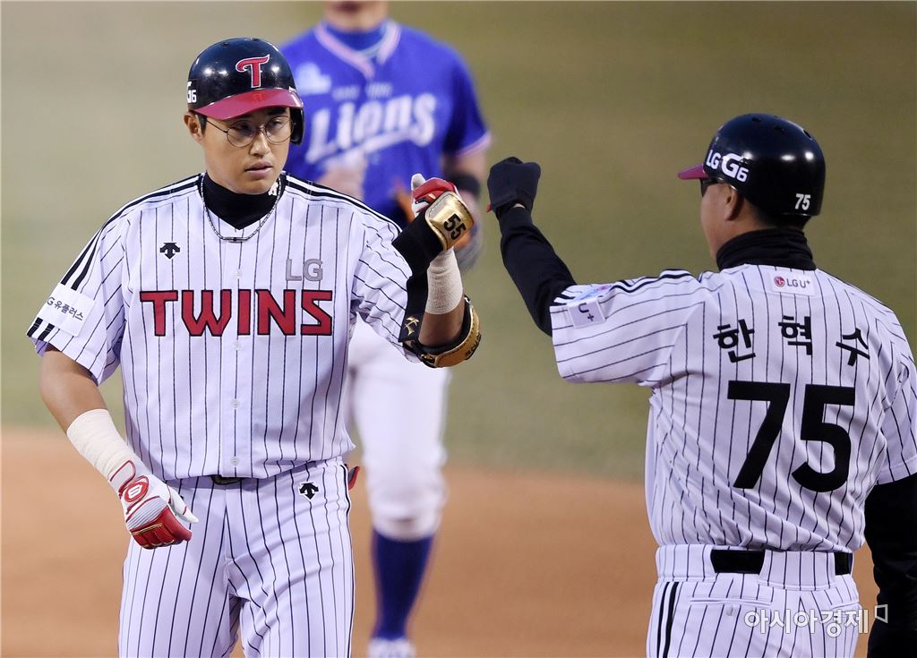 [아시아경제 김현민 기자]프로야구 삼성 라이온즈와 LG 트윈스의 2017 KBO리그 경기가 4일 잠실구장에서 열렸다. 1회 말 1사 만루에서 LG 채은성이 선취 1타점 적시타를 치고 한혁수 코치와 하이파이브하고 있다.김현민 기자 kimhyun81@asiae.co.kr<ⓒ세계를 보는 창 경제를 보는 눈, 아시아경제(www.asiae.co.kr) 무단전재 배포금지>