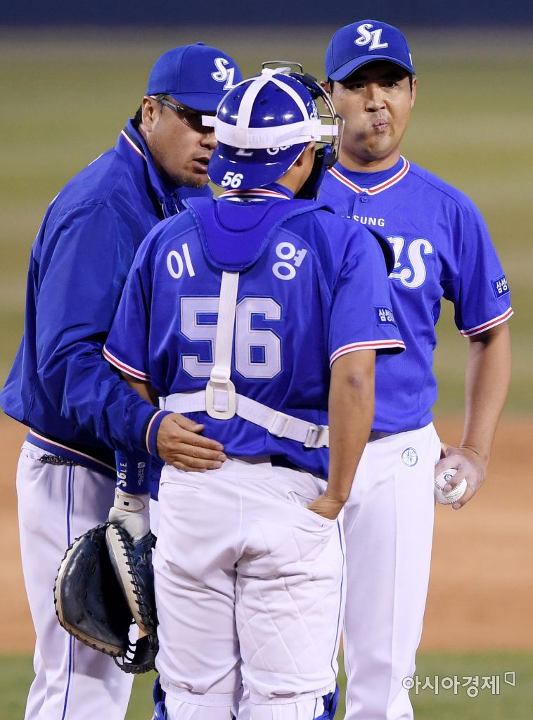 [아시아경제 김현민 기자]프로야구 삼성 라이온즈와 LG 트윈스의 2017 KBO리그 경기가 4일 잠실구장에서 열렸다. 삼성 선발투수 장원삼이 1회 말 2사 2루에서 LG 정성훈이 추가 1타점 2루타를 허용한 뒤 마운드에 올라 온 김상진 투수코치와 이야기를 하고 있다.김현민 기자 kimhyun81@asiae.co.kr<ⓒ세계를 보는 창 경제를 보는 눈, 아시아경제(www.asiae.co.kr) 무단전재 배포금지>