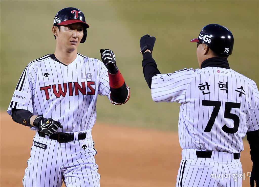[아시아경제 김현민 기자]프로야구 삼성 라이온즈와 LG 트윈스의 2017 KBO리그 경기가 4일 잠실구장에서 열렸다. 1회 말 2사 2,3루에서 LG 손주인이 추가 2타점 적시타를 치고 한혁수 코치와 하이파이브하고 있다.김현민 기자 kimhyun81@asiae.co.kr<ⓒ세계를 보는 창 경제를 보는 눈, 아시아경제(www.asiae.co.kr) 무단전재 배포금지>