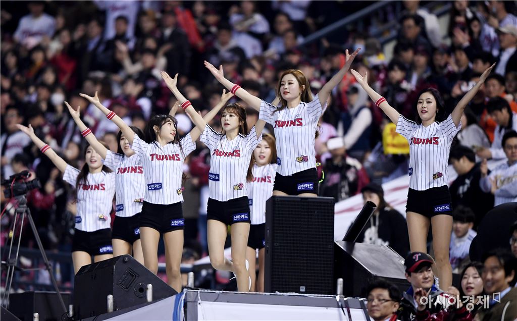 [아시아경제 김현민 기자]프로야구 삼성 라이온즈와 LG 트윈스의 2017 KBO리그 경기가 4일 잠실구장에서 열렸다. LG 치어리더가 열띤 응원을 유도하고 있다.김현민 기자 kimhyun81@asiae.co.kr<ⓒ세계를 보는 창 경제를 보는 눈, 아시아경제(www.asiae.co.kr) 무단전재 배포금지>